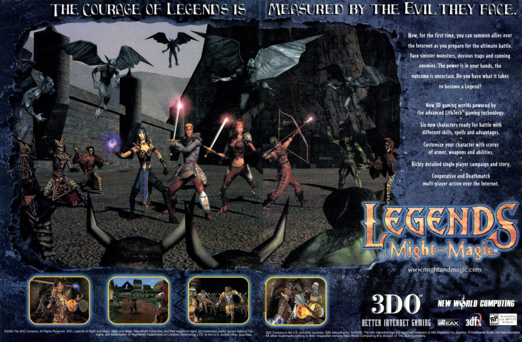 The tone of the ad — “Warrior Embattlements (Without the Messy Clean-Up)” — reflects 3DO’s early 2000s marketing flair, aimed at both RPG fans and a growing PC gaming audience. Screenshots reveal prototype armor, environments, and undead enemies that differ from what would appear in the final version a year later. By mid-2001, the project evolved into the competitive team-based multiplayer title built on LithTech 2.2 (Talon). This advertisement stands as a glimpse into the original ambition behind Legends of Might and Magic — a bridge between the classic Might and Magic adventure roots and the fast-paced, online fantasy combat that ultimately defined its release.